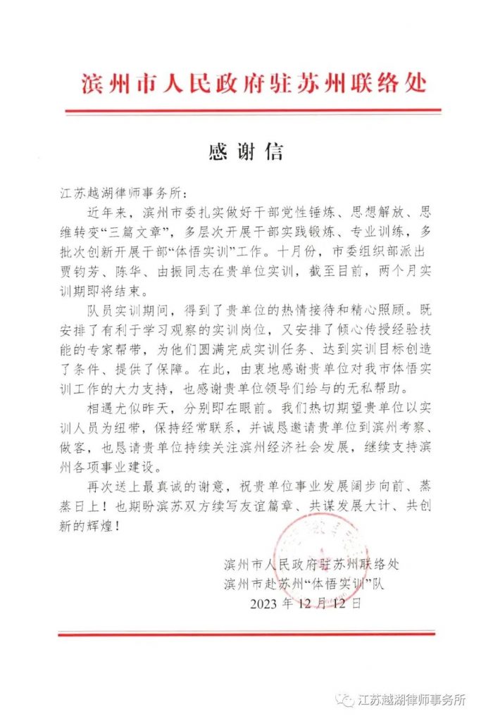 滨州市人民政府驻苏州联络处向越湖律师事务所发来感谢信