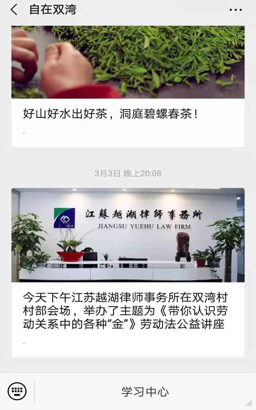 2019年3月3日,江苏越湖律师事务所受吴中区东山镇双湾村村委会的邀请,在村部会场举办主题为《带你认识劳动关系中的各种“金”》劳动法公益讲座。