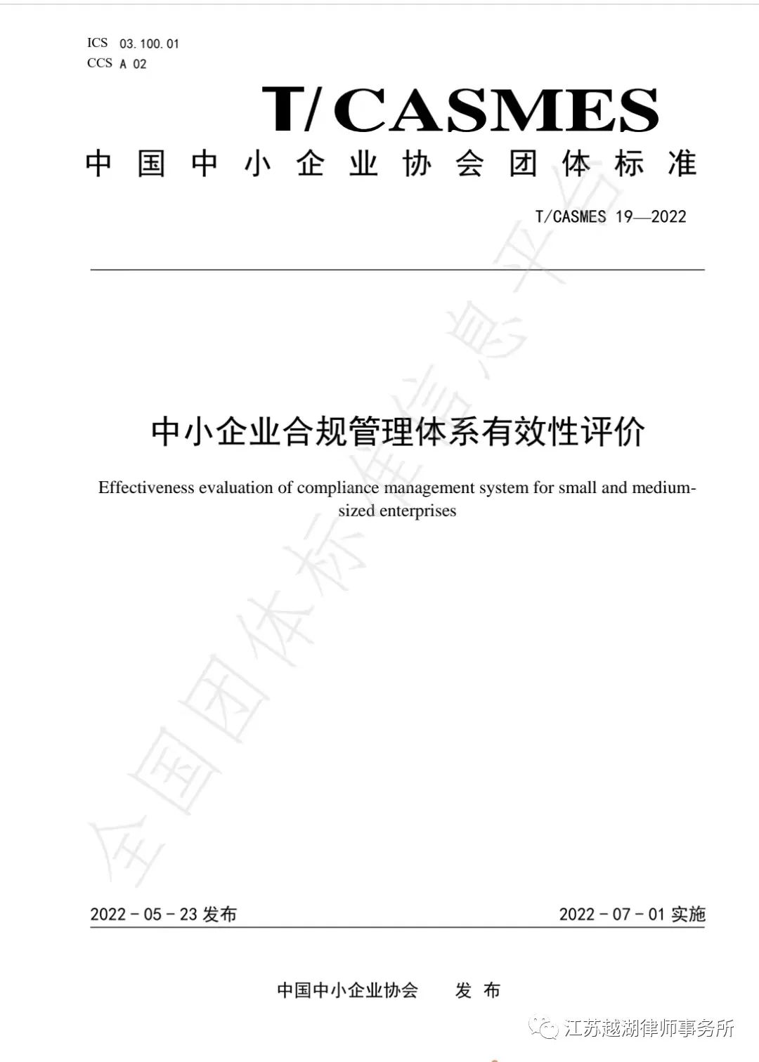 近日,《中小企业合规管理体系有效性评价》团体标准经中国中小企业协会批准正式发布,并于今年7月1 日正式实施。