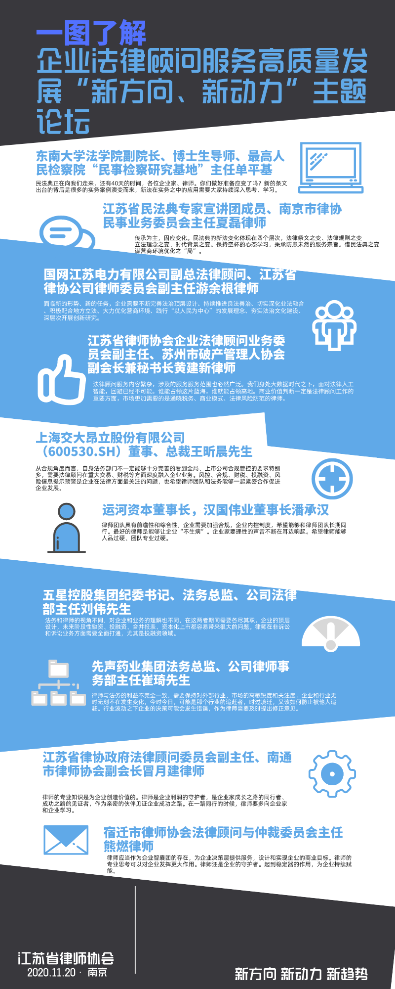 11月20日,越湖律师事务所创始合伙人简连华律师出席江苏省律师协会企业法律顾问委员会年度会议。会议总结了2020年企顾委开展的工作,分别从专题调研、专项工作、专题论坛、实地调研、民法典宣讲等方面进行总结。并讨论了2021年的工作计划,2021年将重点进行苏北、苏中及县域企业法律顾问服务方面的调研、外出学习考察、开展专项论坛、继续为企业宣讲民法典。与会委员分享了各自在提供企业法律顾问服务过程中的经验和心得体会,大家一致认同应充分发挥组织平台作用,彼此提供知识经验方面的分享。